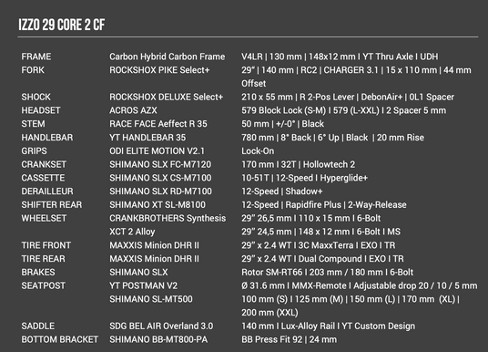 We built the IZZO for rolling singletrack, endless mileage, and venturing to the furthest reaches of the map. It’s a bike set to make light work of climbs, descents, and all that lies between, with 130mm of explosive rear travel on tap to turn trails into playgrounds before returning to plan your next adventure. When combined with the workhorse Shimano XT/SLX drivetrain, buttery RockShox suspension package, and fast-rolling Crankbrothers Synthesis XCT 2 wheels, the carbon hybrid frame comes alive to elevate your rides. This bike delivers on all fronts – prepare for an engaging experience like nothing before.