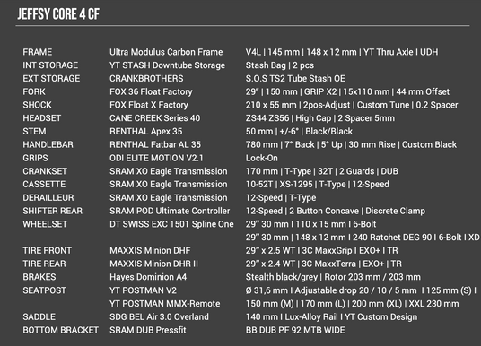 If you're seeking the ultimate wingman for any challenge, look no further than the JEFFSY CORE 4 CF. At this level, we go all out in our hunt for Trail Excellence, sparing no effort as we chase absolute speed, feel, and performance on the trail. Here, you’ll only find A-list parts, matched with our premium Ultra Modulus carbon fiber: FOX Factory suspension, a SRAM X0 transmission drivetrain, and a bombproof DT Swiss carbon wheelset all feature, with each component being hand-selected to elevate your ride experience. Whether you get your kicks from flat-out speed or kilometers on the clock, if you can only have one bike, make it this.