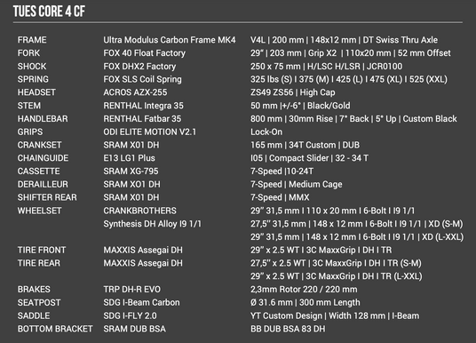 This CORE 4 model is inspired by the YT MOB, and with it, we hold nothing back. FOX Factory suspension powers its performance, and with SRAM X01 shifting, powerful TRP DH-R EVO brakes, and Industry Nine hubs, it lays down race-hardened levels of control to maximize your efforts on the track.